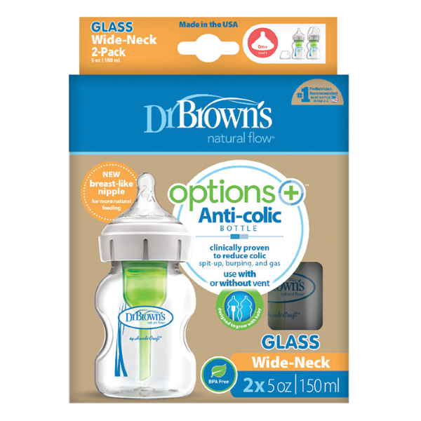 Το γυάλινο μπιμπερό Options+ με φαρδύ λαιμό της Dr Brown's είναι ένα εργονομικά σχεδιασμένο μπιμπερό με φαρδύ λαιμό.