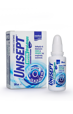 Οι UNISEPT Buccal Oral drops της InterMed είναι στοματικές σταγόνες με ενεργό οξυγόνο για καθαρισμό και επούλωση πληγών.